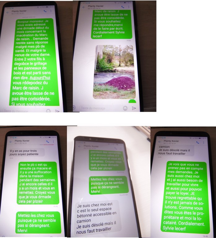 D'ailleurs, le chauffeur est venu me voir en me disant qu'il n'y arrivait pas et qu'il ne comprenait pas pourquoi le marc est stocké là (cela m'a été reproché d'avoir parlé à ce monsieur) je ne suis pas responsable d'habiter à coté du marc de raisin, et donc d'être la personne à qui on vient s'adresser quand il y a un probleme